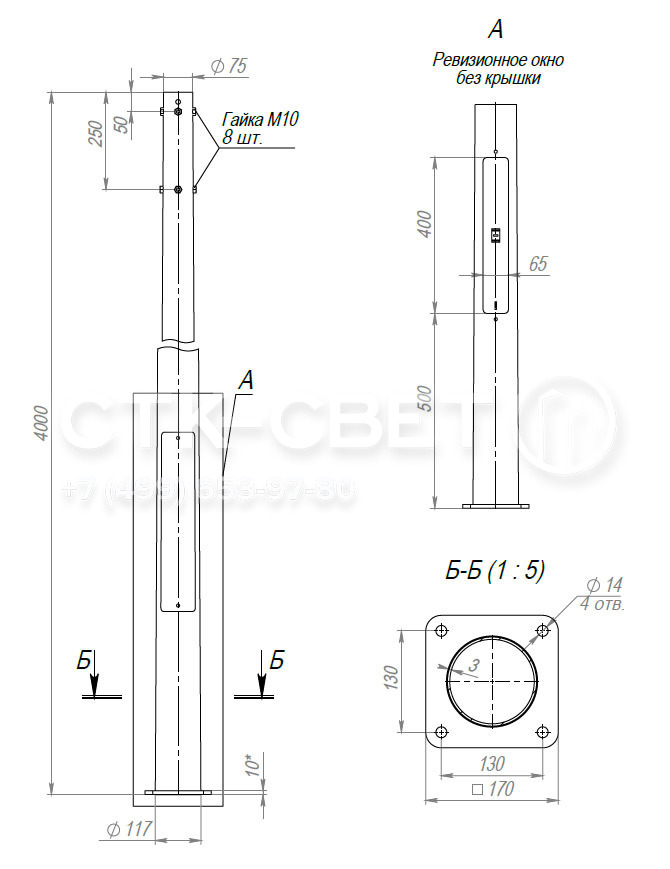 | Тип | Н, м | D1, мм | D2, мм | А/B, мм | d, мм | n, шт | b, мм | Посадочное место кронштейна | Масса, кг | Рекомендуемый фундаментный блок | Нагрузки на фундамент | ||
