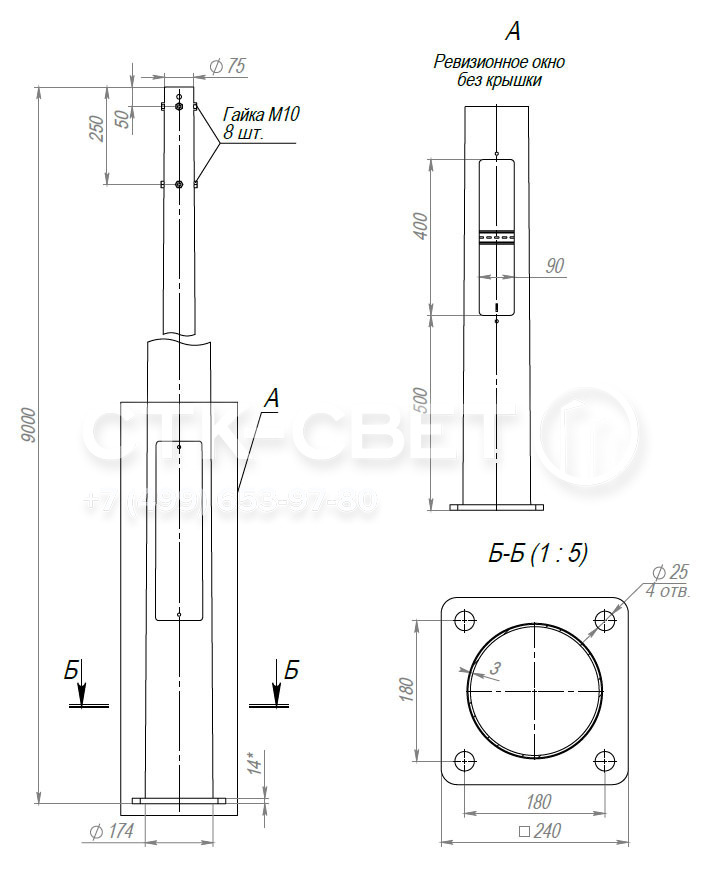 | Тип | Н, м | D1, мм | D2, мм | А/B, мм | d, мм | n, шт | b, мм | Посадочное место кронштейна | Масса, кг | Рекомендуемый фундаментный блок | Нагрузки на фундамент | ||